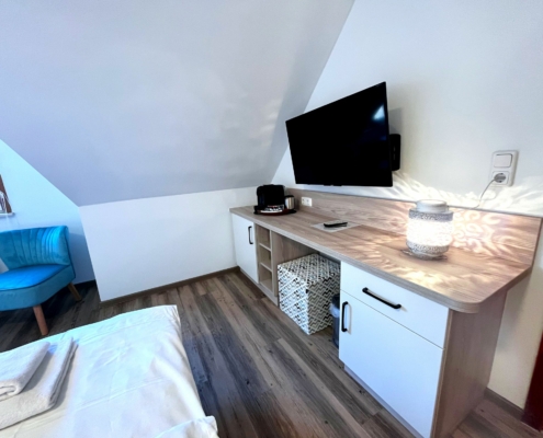 Koje 12 ist ca 25m² groß und liegt in der 1. Etage eines 2 geschossigen Hauses. Das Zimmer mit Schräge, verfügt über einen Vorflur mit Kleiderschrank, von wo aus man zum einen, in das Badezimmer mit Dusche gelangt und zum anderen in das Doppelzimmer. Smart-TV, Kühlschrank, Wasserkocher und Kapselmaschine für verschiedene Tee- und Kaffeesorten stehen für Sie bereit.